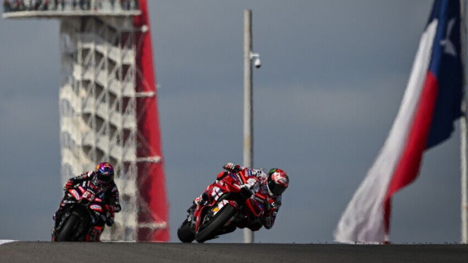 Una definición atrapante tuvo la carrera sabatina de la máxima categoría del campeonato mundial de Motociclismo en la pista de Austin, con el español primero arrebatándole el triunfo al italiano y luego cayéndose en la vuelta de honor.