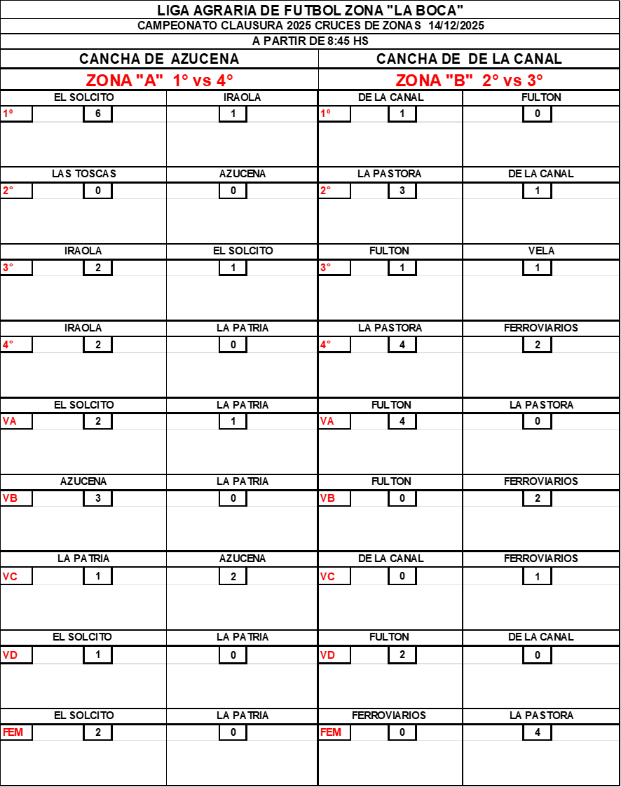 Este domingo se jugaron los cruces de zonas del Clausura 2025 que organiza Liga Agraria de Futbol Zona "La Boca". Victorias de El Solcito y De La Canal.