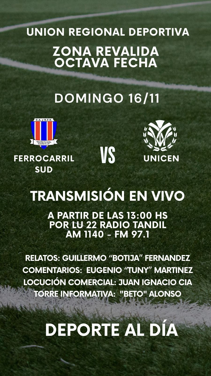 Se sigue disputando la octava fecha de la URD y ahí estará nuestro equipo deportivo. Desde las 13 horas Ferrocarril Sud recibe a Unicen y lo vivís por LU22 Radio Tandil AM 1140 y Galáctica Fm 97.1 con relatos de Guillermo "Botija" Fernández, comentarios de Eugenio "Tuny" Martínez, locución comercial Juan Cia, torre informativa Beto Alonso. La Radio, la URD, Deporte al Día y vos... Juntos a la Par!!!