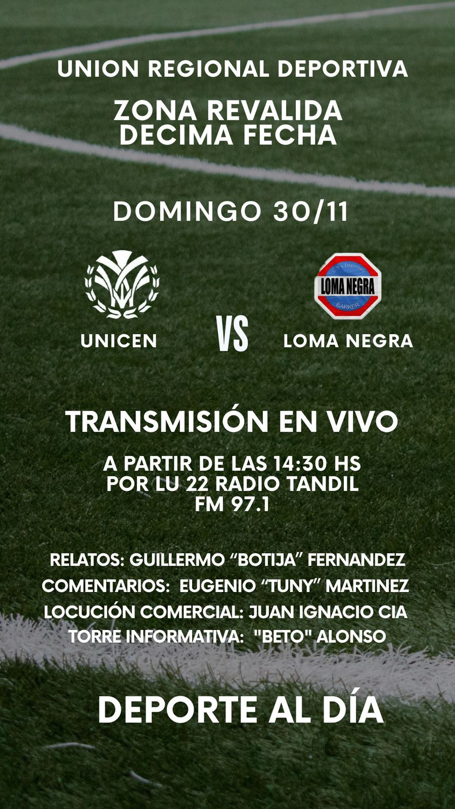 Se define la URD y ahí estará nuestro equipo deportivo. Desde las 14:30 horas juegan Unicen-Loma Negra con relatos de Guillermo Botija Fernández, comentarios de Eugenio Tuny Martínez, locución comercial Juan Cia, torre informativa Beto Alonso. La Radio, Deporte al Día y vos... Juntos a la Par!!!