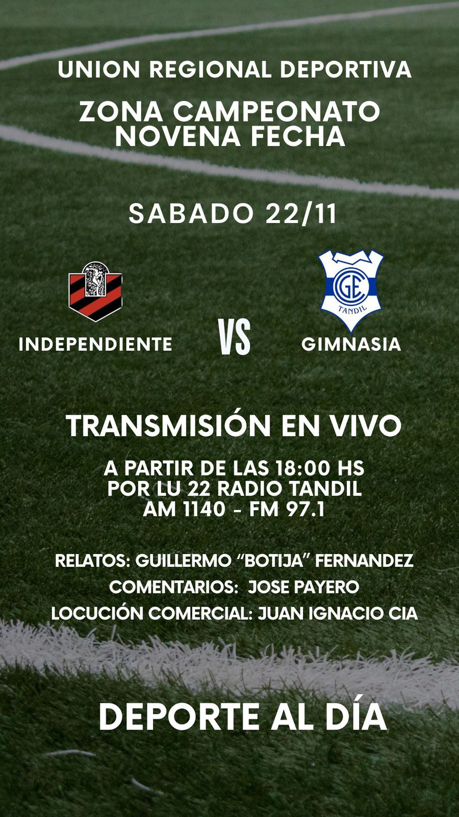 Se empieza a definir el Clausura de la URD y ahí estará nuestro equipo deportivo. Desde las 18 horas por LU22 Radio Tandil AM 1140 y Galáctica FM 97.1 juegan Independiente y Gimnasia con relatos de Guillermo "Botija" Fernández, comentarios de José Luis Payero, locución comercial Juan Cia. La Radio, Deporte al Día y vos... Juntos a la Par!!!